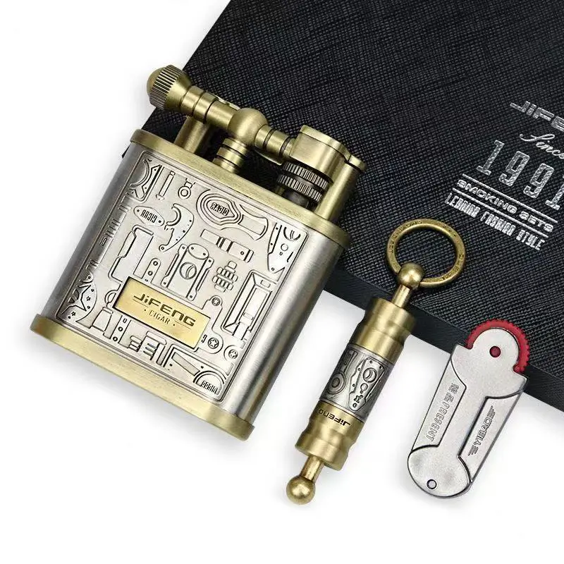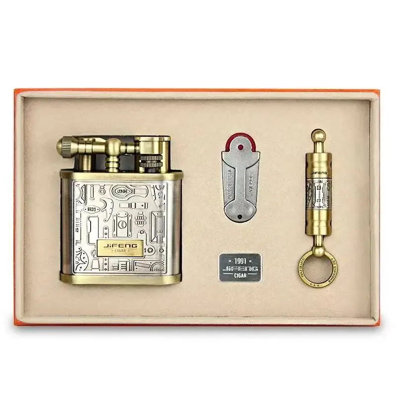 Duel jet flame butane gas lighter + cigar hole puncher + flint silo comes packaged in a gift box. This high quality, old style lighter is one of a best selection for every day carry and for collectors. For optimal performance, fill with Zorro or Zippo lighter fuel.