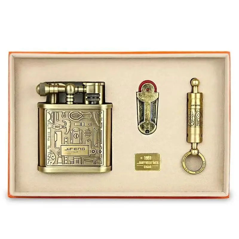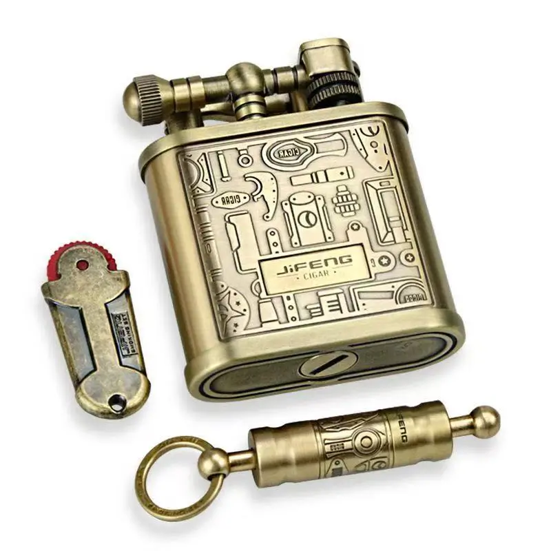 Duel jet flame butane gas lighter + cigar hole puncher + flint silo comes packaged in a gift box. This high quality, old style lighter is one of a best selection for every day carry and for collectors. For optimal performance, fill with Zorro or Zippo lighter fuel.