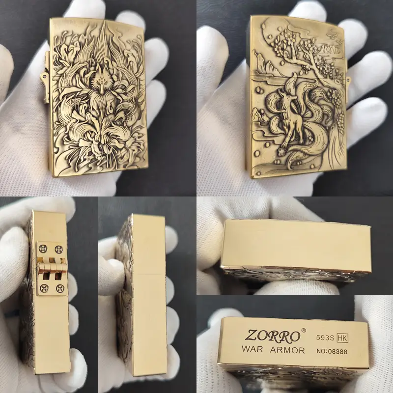 Genuine Zorro gigantic 593S model custom engraved designs made with pure brass comes packaged in a gift box. This all sides 3D engraved heavy- duty armor shell can be used suitable Zorro kerosene movements. For optimal performance, fill with Zorro or Zippo lighter fuel.