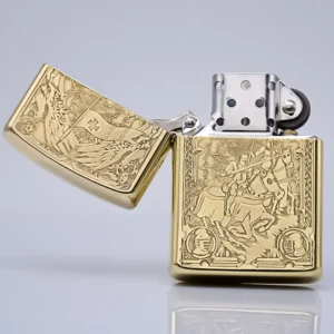 Genuine Zorro 902S model customizations are made with pure brass comes packaged in a gift box. This high quality wind/ water sealed lighter can be used with both butane and kerosene Zorro or Zippo liners. For optimal performance, fill with Zorro or Zippo lighter fuel.