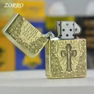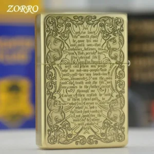 Genuine Zorro 902S model customizations are made with pure brass comes packaged in a gift box. This high quality wind/ water sealed lighter can be used with both butane and kerosene Zorro or Zippo liners. For optimal performance, fill with Zorro or Zippo lighter fuel.
