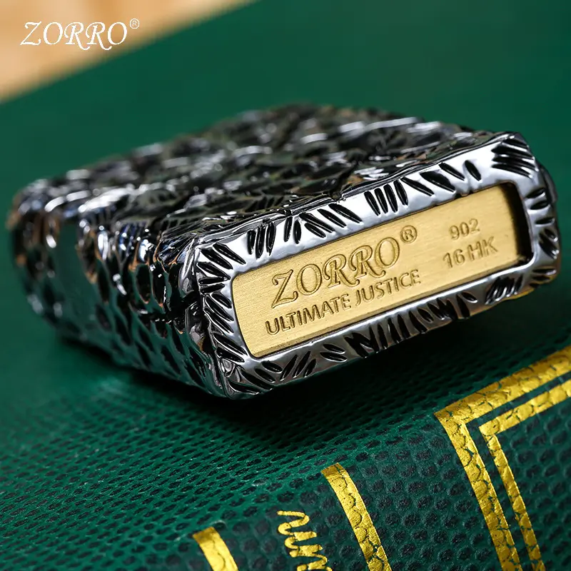 Genuine Zorro 902S model all 5 sides tang grass 3D engraving is made with white copper comes packaged in a gift box. This high quality wind/ water sealed lighter can be used with both butane and kerosene Zorro or Zippo liners. For optimal performance, fill with Zorro or Zippo lighter fuel.